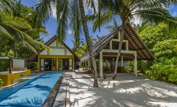 The Beach Bungalows with Pool (75sqm) are located on the north side of the island, offering views of the ocean and surrounding gardens. They are built in native Maldivian style with contemporary-style teak furniture, a king size bed (or two twin beds) and bathroom, plus an outdoor garden shower. Enjoy the al fresco style with your own private pool, and the open-air "bale" (traditional thatched hut) which serves as the living and dining area.