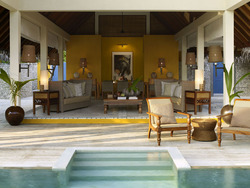The two-bedroomed Family Beach Bungalows with Pool (182sqm) have their own beachfront and private pool - they are situated on the north side of the island. The bungalows feature a second bedroom linked by a short corridor, making them ideal for families travelling with older children or teenagers. The open-air "bale" (traditional thatched hut) serves as the living and dining area. There is a king size bed, plus two twin beds, and two full bathrooms.