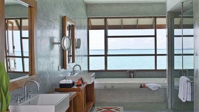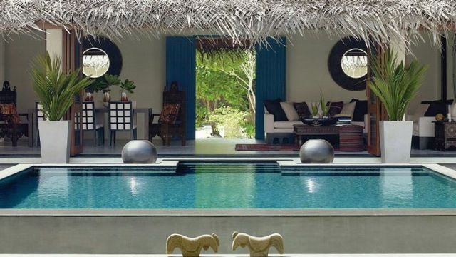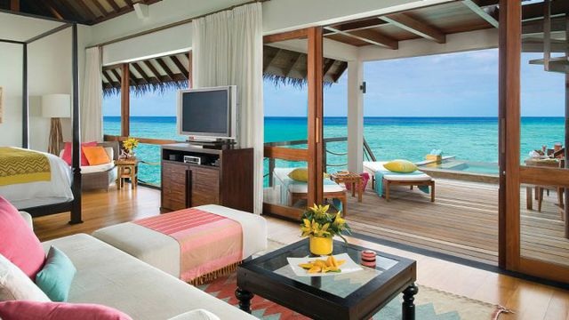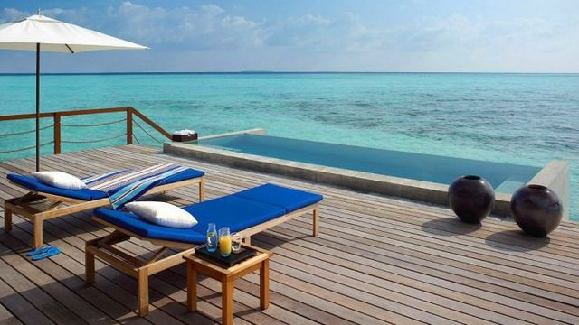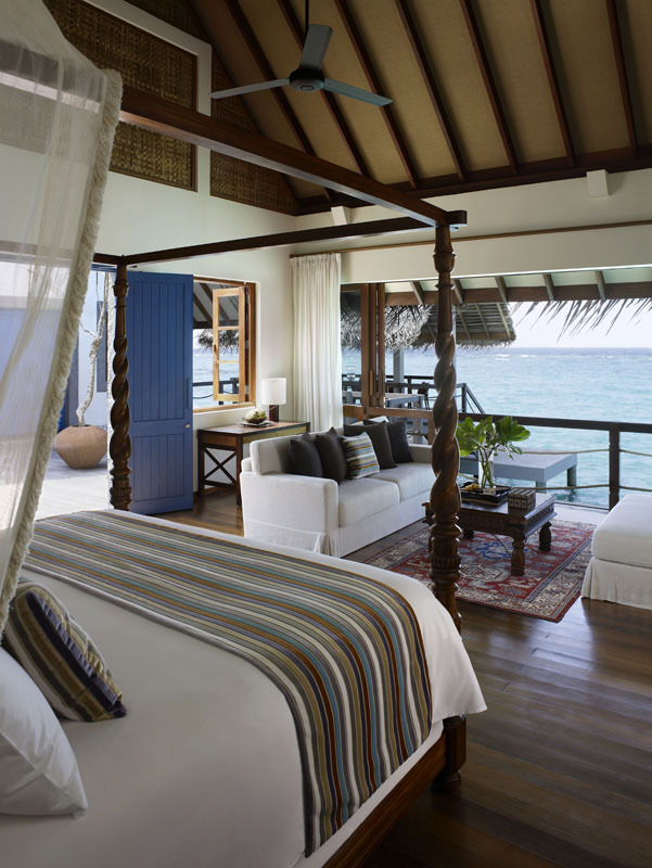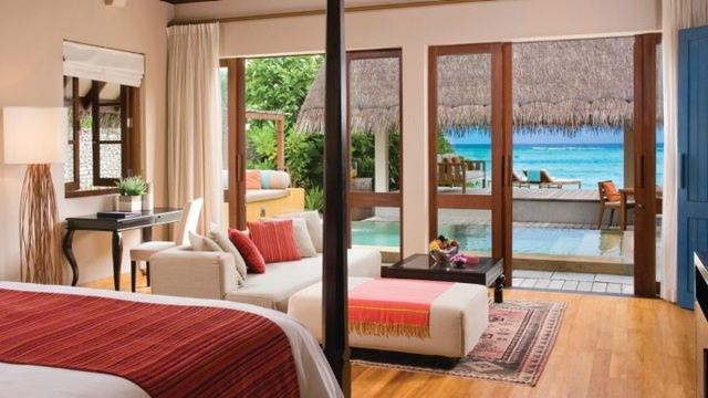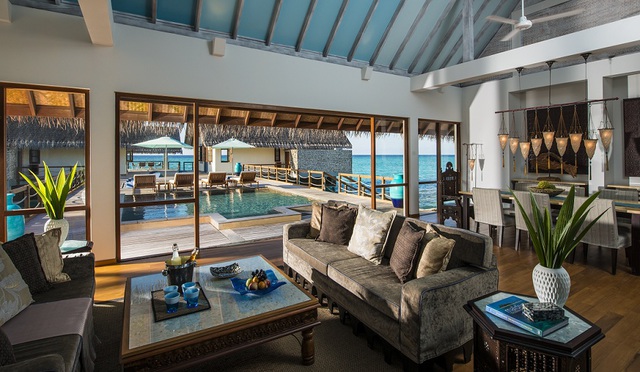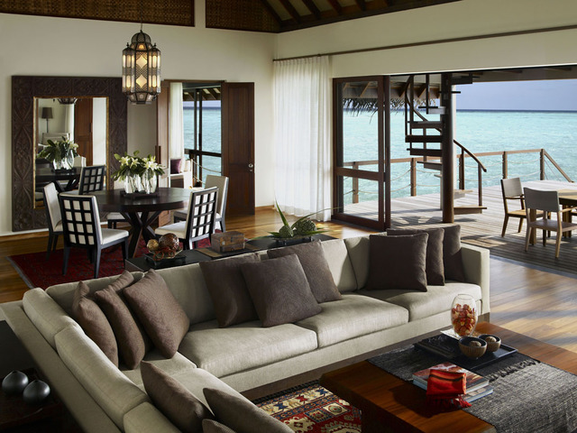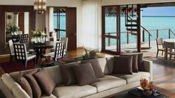 This luxurious two-bedroom Sunrise Water Suite is on stilts over the water on the nortwestern end of the island, offering stunning panoramic views of the ocean and sunrise. The suite is built in native Maldivian style (182sqm), fitted with contemporary-style teak furniture, a king size bed, two twin beds, two full bathrooms plus three outdoor showers. The sprawling deck contains a private pool, sea-gazing, dining and lounging areas and steps descending to the crystal waters below.