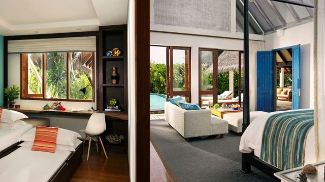 The Family Beach Villa with Pool (164sqm) is just steps from the lagoon on the south side of the island and features a 12-metre lap pool, sand-floor living room and spacious study with sofabed - ideal for families with small children. As well as a sofabed the study offers a desk, TV and adjacent full bathroom with shower. There is a king size bed, plus two twin beds, separate dressing area, and an additional outdoor garden shower. Let the family enjoy the al fresco style with open-air living and dining pavillion, complete with furnished loft for ocean viewing.