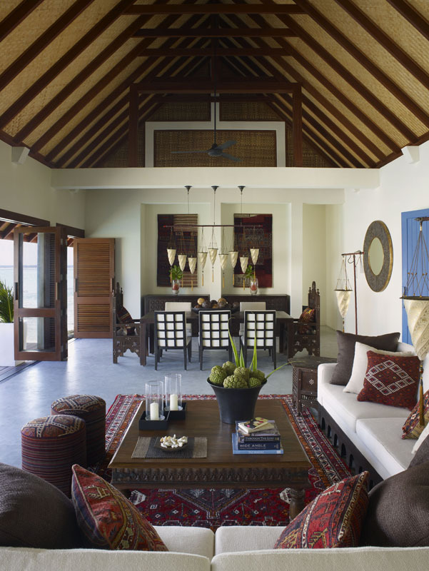 The beautiful two-bedroom Royal Beach Villa is on the western side of the island, offering uninterrupted views of the ocean with the privacy of lush gardens. The suite contains two bedrooms (one with king bed, one with twin beds), three full bathrooms, a guest powder room and two outdoor garden showers. Construction is in the native Maldivian style with contemporary-style teak furniture and elegant decor. There is a "floating island" dining room from which you can admire the reflections in your private lap pool. All home comforts are provided.