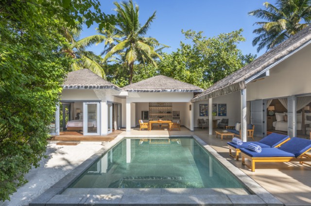 Each villa includes a private pool, a yoga mat, a walk-in shower with a separate bathtub, a personal bar, a 55-inch HD LED television, a high-quality surround-sound audio system, complimentary high-speed Wi-Fi, 24-hour in-villa dining, and the dedicated support of the Halcyon Butler service.